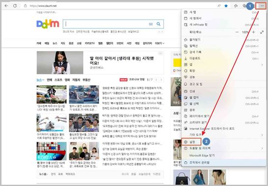 1. 구글 크롬과 마찬가지로 브라우저의 우측 상단에 점세개 모양의 전체 설정을 클릭한 후 설정 메뉴로 진입합니다.