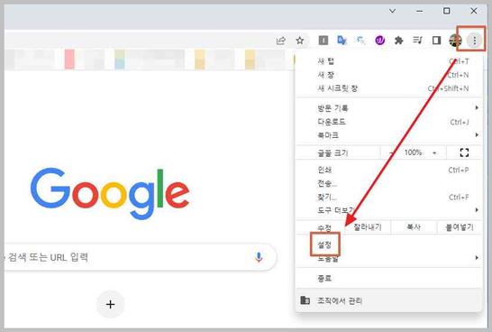 1. 구글 크롬 브라우저의 우상단에 보시면 점세개가 있습니다. 이것이 전체 설정으로 점세개를 클릭 후 설정 메뉴를 클릭합니다.